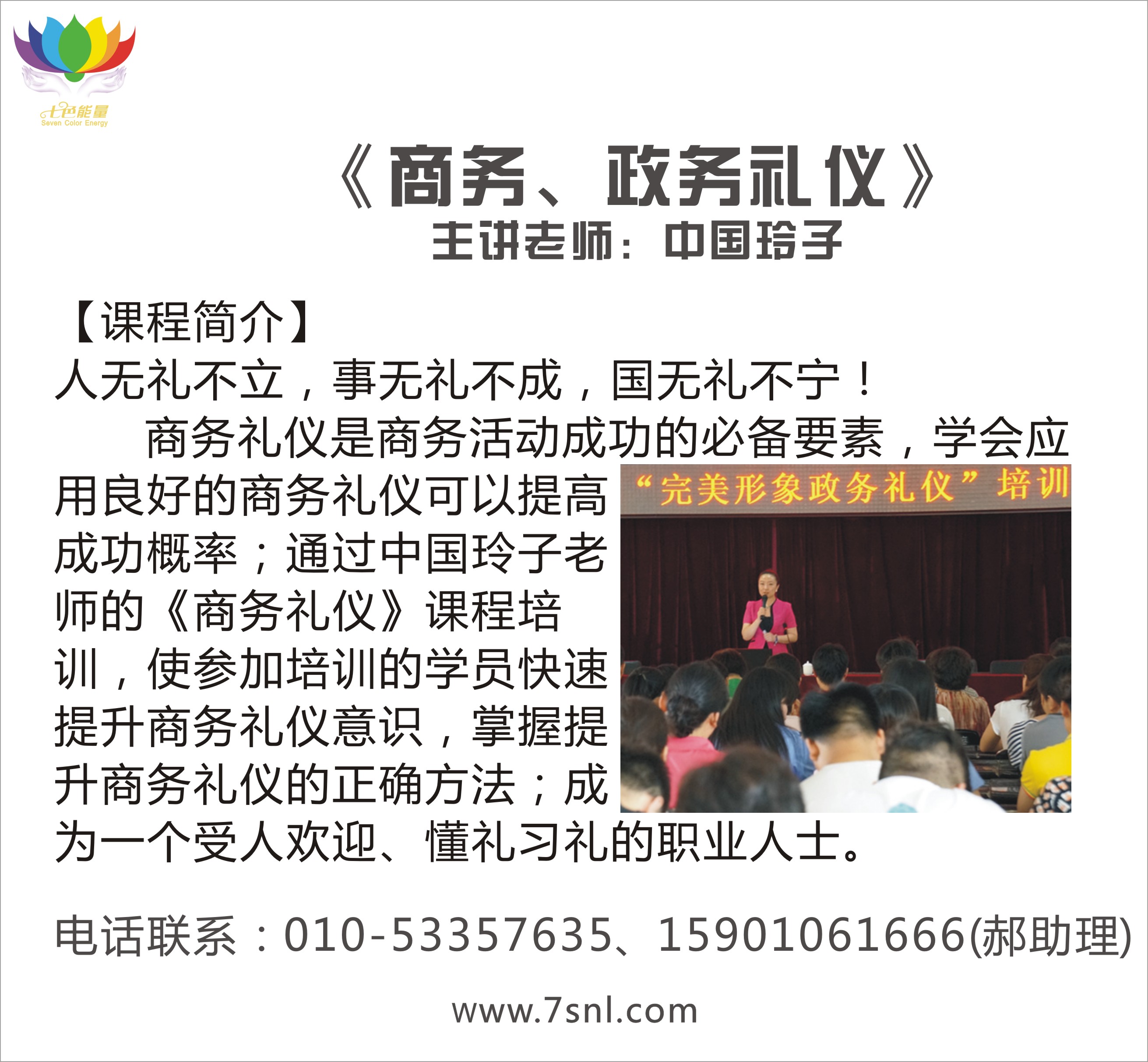 北京七色能量文化傳播公司,由七色能量创始人中国玲子女士领衔创办。中国玲子女士研究色彩能量16年,形象礼仪培训12年,是著名色彩能量导师、形象礼仪导师;曾荣获中国形象设计师大赛全国冠军、中国最佳形象礼仪导师、中国十强形象礼仪导师等称号。七色能量公司凝聚了国内外一批资深专家,专注形象礼仪、色彩能量培训;形象设计、色彩能量设计、色彩能量相关产品研发,旨在为更多人达成美丽富足的梦想,勇于超越自我,为使命传爱天下!